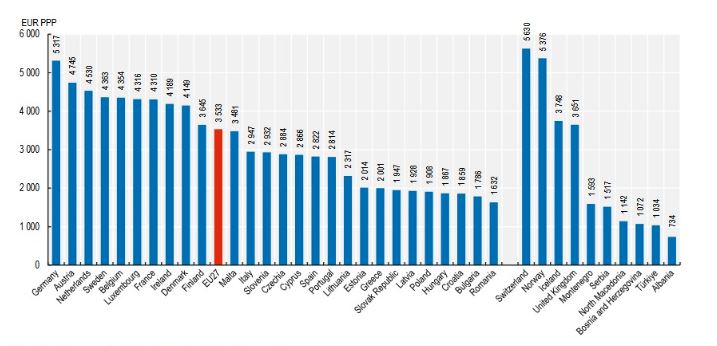 Po ta krahasojmë me mesataren e Bashkimit Europian, ajo është 481% më shumë se në Shqipëri, ose 3.533 euro për frymë në vit.