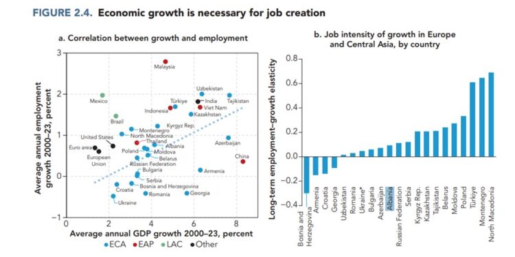 Për çdo 1% rritje ekonomike, punësimi është zgjeruar 0.15–0.2%, shumë më i ulët se në vende si Turqia, Mali i Zi apo Maqedonia e Veriut, të cilat kanë përfituar më shumë në krijimin e vendeve të reja të punës nga rritja ekonomike.