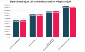 Në kahun tjetër, familjet me arsim të mesëm kanë shënuar rritje të lehtë të konsumit, nga 96,176 lekë në 96,790 lekë, ndërsa ato me arsim 8/9-vjeçar kanë qëndruar pothuajse në të njëjtin nivel. Ndërkohë, familjet me arsim të ulët ose pa arsim të përfunduar kanë rritur disi konsumin, nga 62,840 lekë në 64,013 lekë, ndoshta si rezultat i rritjes së pagës minimale dhe politikave të ndihmës sociale që kanë lehtësuar presionin mbi buxhetet e tyre.