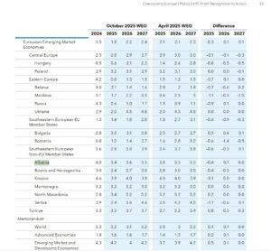 Sipas FMN-së, rritja në Europën Juglindore jashtë BE-së pritet të zbutet në 2025, pasi efektet e rimëkëmbjes së fortë në turizëm dhe ndërtim po veniten, ndërkohë që kushtet më të shtrënguara të financimit dhe kërkesa më e dobët e jashtme po kufizojnë investimet.