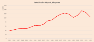 Të dhënat e tjera të INSTAT tregojnë se eksportet e tekstile e këpucë ranë me 16.8% në 2024-n, në raport me vitin e mëparshëm. Tendenca ka vijuar negative edhe në 8 mujorin 2025, ndonëse me ritme të ngadalësuar, me shitjet jashtë vendit të këtij produkti që u tkurrën me 1%./Monitor