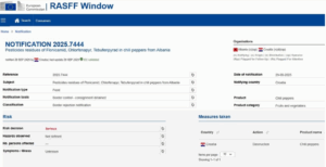 Në njoftim thuhet se në specat djegës nga Shqipëria janë identifikuar 3 lloje pesticidesh mbi normë, Flonicamidit, Chlorfenapyr dhe Tebufenpyrad, ndaj është dhënë alarmi, dhe ngarkesa është bllokuar për t’u asgjësuar.