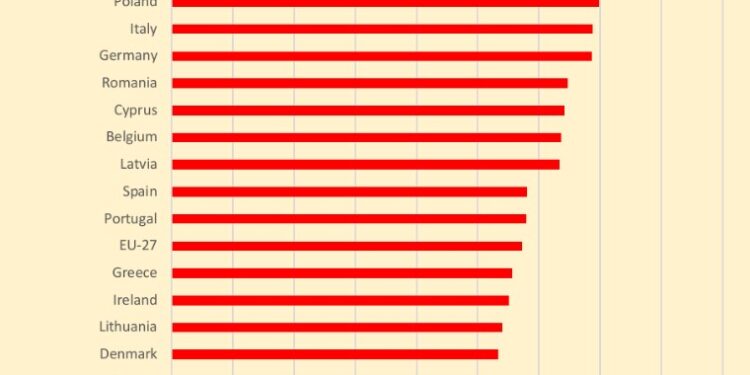 Në BE, Çekia dhe Polonia kryesojnë për çmimet më të larta me 0.39 dhe 0.34 euro/kWh secila, të ndjekura nga Gjermania dhe Italia.