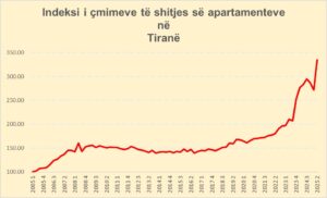 Sipas të dhënave të indeksit të çmimit të shitjes së publikuar nga “Keydata” që prej vitit 2005, kur indeksi i çmimeve u llogarit në nivelin bazë 100 deri në 3-mujorin e dytë të vitit 2025, vlera e indeksit të apartamenteve në Tiranë është rritur me më shumë se 230%.