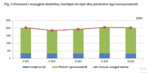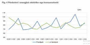 Përdorimi i energjisë elektrike nga konsumatorët, në tremujorin e tretë të vitit 2025, u ul me 0,1 %, duke arritur vlerën 1.700 GËh nga 1.702 GËh që ishte në tremujorin e tretë të vitit 2024. Në uljen e përdorimit të energjisë elektrike nga konsumatorët kanë ndikuar kryesisht konsumatorët jo familjarë, të cilët shënuan një ulje të konsumit me 0,3 %, ndërsa konsumatorët familjarë regjistruan një rritje të lehtë prej 0,1 %, krahasuar me tremujorin e tretë të vitit 2024.
