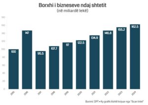 Përgjatë dhjetë viteve të fundit stoku i borxhit të biznesit është rritur vit pas viti, përjashtim bën vetëm 2017-ta.  Në vitin 2023, bizneset shqiptare i detyroheshin shtetit rreth 155.2 miliardë lekë.