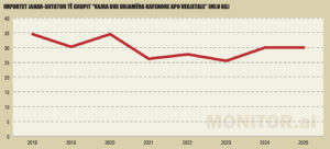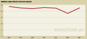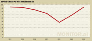 Në raport me të njëjtën periudhë të 2024-s, importet ranë me 3%. Për vitin 2024 u importua një sasi prej 204 mijë tonësh grurë. Në raport me vitin paraardhës, importet u rritën me 6,4%.