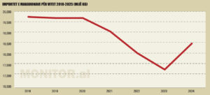 Pavarësisht rënies së tyre dhe shtimit të prodhimit, importet vijuan të zënë peshën kryesore të tregut në vend. Për janar – shtator 2025, pesha e tyre arriti 58% kundrejt peshës prej 42% që zuri prodhimi vendas.