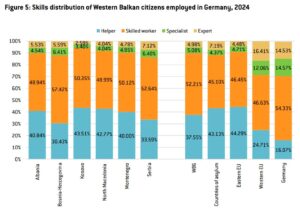 Sipas raportit, 40.84% e shqiptarëve në Gjermani punojnë si “helper” (ndihmës), një kategori që përfshin punë të pakualifikuara ose gjysmë-kualifikuara, si punë fizike, logjistikë, shërbime dhe industri bazë. Ky është ndër nivelet më të larta në rajon, krahasuar me Bosnjën (30.43%) dhe Serbinë (33.59%).