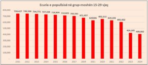 Të dhënat e INSTAT tregojnë se në vitin 2024 në të gjithë vendin kishte vetëm 405 mijë të rinj të moshës 15–29 vjeç, ose 45 për qind më pak se në censin e vitit 2011.
