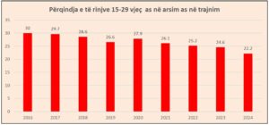 Në grupmoshën 15–24 vjeç, norma e NEET arrin në 21.3 për qind. Në grupmoshën 25–29 vjeç, situata përkeqësohet ndjeshëm, norma e NEET ngjitet në 31.1 për qind dhe përqindja e të rinjve që janë tërësisht inaktivë rritet dukshëm, sidomos mes grave.