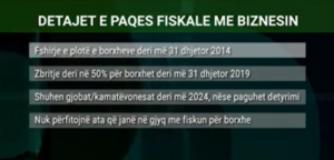 Paqja fiskale fal të gjitha detyrimet e patraguara të biznesit deri më 31 dhjetor 2014’fal 50% të detyrimeve deri më 31 dhjetor 2019, nëse paguhet menjëherë pjesa tjetër; bfalen gjobat dhe kanatvonesat e detyrimeve të kriujuara deri vitin e kaluar, nëse paguhet i plotë borxhi. Nga kjo amnisti nuk përfitojnë ato biznese që janë në proces gjyqësor me tatimet dhe doganat për cështje detyrimesh.