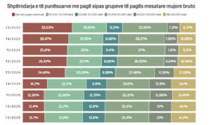 Ndërkohë është shtuar kategoria e punonjësve që marrin paga të larta. Kjo zhvendosje sugjeron një shpërndarje më të balancuar të të ardhurave dhe një strukturë pagash më të orientuar drejt niveleve të mesme dhe të larta.