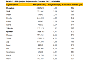 Në vitin 2023, produkti i brendshëm bruto nominal i Shqipërisë arriti në 2.364 miliardë lekë, me një rritje reale prej 4,02 për qind krahasuar me vitin paraardhës. Megjithatë, kjo rritje fsheh një pabarazi të thellë rajonale: 50,26 për qind e prodhimit ekonomik gjenerohet në Rajonin Qendër, ku Tirana kontribuon me 43,8 për qind të totalit kombëtar dhe mbledh 77 për qind të të gjitha taksave. Në të kundërt, Rajoni i Veriut siguron vetëm 22,49 për qind, ndërsa Rajoni i Jugut 27,25 për qind, me kontribute minimale nga qarqe si Kukësi, Dibra dhe Gjirokastra.