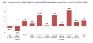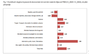 Kontributi sipas aktiviteteve ekonomike paraqitet si më poshtë: “Administrata publike, Arsimi dhe Shëndetësia” me +1,68 pikë përqindje, “Tregti, Transport, Akomodim dhe Shërbim ushqimor” me +0,62 pikë përqindje, “Aktivitete të pasurive të paluajtshme” me +0,50 pikë përqindje, “Ndërtimi” me +0,48 pikë përqindje, “Aktivitete profesionale dhe Shërbime administrative” me +0,15 pikë përqindje, “Informacioni dhe Komunikacioni” me +0,21 pikë përqindje, “Arte, argëtim dhe çlodhje; aktivitete të tjera shërbimi” me +0,08 pikë përqindje, dhe “Aktivitete Financiare dhe të Sigurimit” me +0,01 pikë përqindje. Aktiviteti “Industri, Energji dhe Uji” kontribuoi me -0,48 pikë përqindje dhe “Bujqësi, Pyje dhe Peshkim” kontribuoi me -0,26 pikë përqindje dhe “Taksat Neto mbi produktet” kontribuan pozitivisht me +0,76 pikë përqindje.