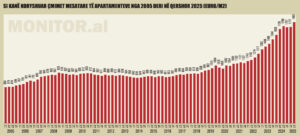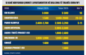 Sipas një vëzhgimi në terren të “Monitor” brenda nëntë muajve në 2025, çmimet e apartamenteve në Tiranë kanë shënuar rritje të ndjeshme, ku zonat me shtrenjtimin më të shpejtë rezultojnë të jenë ish-Blloku, pranë Liqenit Artificial, Porcelani dhe zona pranë Parkut Olimpik.