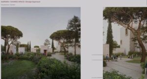 Ne fillojmë me oborrin që në mënyrë kolektive formëson jetën në këtë kampus. Shtëpitë lidhen me njëra tjetrën duke ruajtur individualitetin dhe janë të pavarura. Organizimi mundëson ndriçim natyror dhe lejon më shumë lëvizshmëri dhe ndërveprim më lozonjar. Kemi oborre që ndërveprojnë duke u shkrirë. Pra këto oborre ofrojnë hapësirë për aktivitetet dhe kanë mundësi të luajnë gjatë gjithë vitit. Ka bibliotekë një hapësirë ku studiohet, zyrat administrative|, u tha gjatë prezantimit.