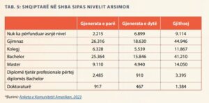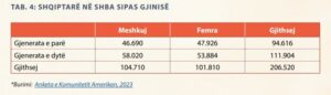 Të dhënat e Anketës së Komunitetit Amerikan për vitin 2023, të përpunuara nga INSTAT në raportin “Diaspora 2025” tregojnë se, shqiptarë të gjeneratës së parë në vitin 2023 janë 94.616, ndërsa gjenerata e dytë është 111.904. Pra, në total janë 206.520 shqiptarë që jetojnë në SHBA. Gjeneratën e parë, nëse e shohim sipas vitit të emigrimit në SHBA vëmë re se, rreth 95 % e tyre kanë emigruar pas viteve 1990.