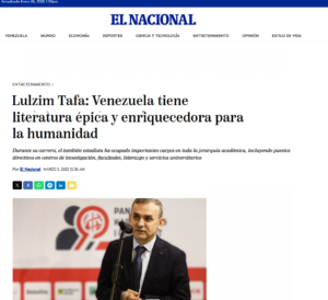 Poeti i mirënjohur kosovar Lulzim Tafa, në muajin mars të vitit të kaluar, i ka dhënë një intervistë të gjatë për letërsi gazetës kryesore në Venezuelë, El Nacional, e njohur për qëndrimin e saj kundër regjimit të Chávezit dhe Maduros. Tafa, para pak kohësh është botuar në gjuhën spanjolle në Paraguai dhe gëzon një reputacion të madh në Ameriknën Latine.