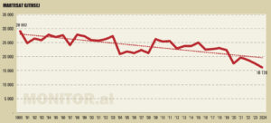 Pas vitit 2015, trendi bëhet qartësisht negativ, me një përshpejtim të rënies pas vitit 2019. Pandemia e thellon më tej këtë prirje, por rënia nuk ndalet as pas saj.