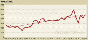 Nga fundi i viteve ’90, kur treguesi zbriti në minimumin historik prej 5.9 në vitin 1997, divorci nisi një ngjitje të pandalshme gjatë viteve 2000 dhe 2010, duke kaluar mbi 20 ndarje për 1 000 martesa që pas vitit 2018.Raportimi më i fundit tregon se viti 2024 shënon një rekord absolut prej 29.8 divorceve për 1 000 martesa, niveli më i lartë i regjistruar ndonjëherë në vend.
