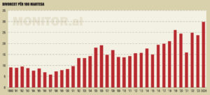 Sakaq edhe treguesi i divorceve për 1 000 martesa, i cili në vitin 1990 ishte 9.2, ka ndjekur një trajektore rritëse për më shumë se tri dekada, por vitet e fundit kanë thyer çdo rekord të mëparshëm.