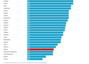 Në rajon, Shqipëria, që dikur ishte e parafundit (Turqia e fundit) ka lënë pas dhe Bosnjë Hercegovinën (321), Maqedoninë e Veriut (318) dhe Kosovën (232). Në rajon na e kalon Mali i Zi (417) dhe Serbia (377).