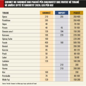 Analiza e tregut të shumicës në Shqipëri për muajin shkurt 2026, mbështetur në databazën e çmimeve të përditësuara në Portalin e Fermerit, tregon vështirësitë që sjell sezoni i dimrit për bujqësinë vendase.