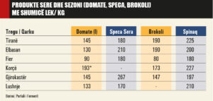 Një kilogram spinaq fushë u shit me shumicë, sipas të dhënave nga Portali i Fermerit, më 6 shkurt me 160 lekë për kilogram, ndërsa me pakicë, çmimi arriti në të njëjtën ditë në kryeqytet në 300 lekë/kg. Brokoli gjithashtu nga 190 lekë me shumicë shitet rreth 250-300 lekë me pakicë në tregjet e Tiranës në të njëjtën ditë.
