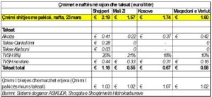 Në total, aktualisht, një shqiptar paguan në një litër naftë 1.16 euro taksa, (53% të çmimit final); një qytetar maqedonas 0.58 euro për litër (36% të çmimit final); një malazez 0.55 euro (35% të çmimit final); një shtetas i Kosovës 0.67 euro, ose 38.5% të çmimit final.