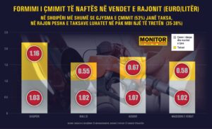 Në Shqipëri, elementi që shton më shumë barrën fiskale është taksa e qarkullimit prej 27 lekë për litër. Akciza është fikse, 39.4 lekë për litër dhe 3 lekë është taksa e karbonit. Mbi këto llogaritet TVSH-ja, që është 20% mbi çmimin final (përfshirë taksat e tjera), ndryshe nga rajoni që TVSH nuk e ngarkon mbi taksat e tjera.