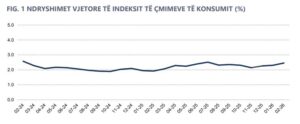 Konsumatorët shqiptarë po përballen me rritje të çmimeve. Instituti i Statistikave konstaton se në shkurt, inflacionii arriti në 2.5% nga 2.3% ishte një muaj më parë. Ndërkohë që në shkurtin e një viti më parë, ky tregues ishte në nivelin 1.9%, cka do të thotë një rritje me 0.6% në harkun kohor të një viti. Inflacioni ka arritur nivelin më të lartë në shtatë muajt e fundit.