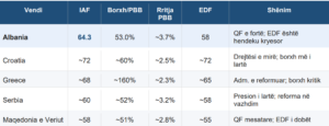 Indeksi i Fiskalitetit 2025 i ALTAX lidhur me stabilitetin e financave publike, me 64.3 pikë e vendos Shqipërinë 7.7 pikë nën Kroacinë (∼72) dhe 3.7 pikë nën Greqinë (∼68). Hendeku është thuajse plotësisht i atribuueshëm diferencës EDF (58 vs ~72 për Kroacinë), jo disiplinës makro-fiskale. “Shqipëria tejkalon të dyja në borxh/PBB dhe rritje të PBB-së, duke konfirmuar se sfida e integrimit europian është kryesisht çështje reformimi të drejtësisë fiskale, jo menaxhimi makro”, thekson ALTAX.