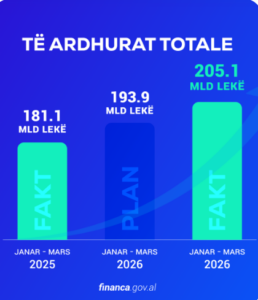Në tremujorin e parë të këtij viti, të ardhurat në buxhetin e shtetit janë rritur, cka dëshmon për një forcim të financave publike. Sipas të dhënave të Ministrisë së Financave, të ardhurat totale, për periudhën Janar-Mars 2026, arritën në rreth 205.1 miliardë lekë, 105.8 % e planit të periudhës. Krahasuar me të njëjtën periudhë të një viti më parë, u mblodhën rreth 24 miliardë lekë ose 13.3 % më shumë.
