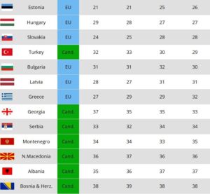 Nëntë pozicionet e fundit dominohen nga vendet kandidate për në BE, me Ukrainën, Kosovën dhe Moldavinë që mbyllin tabelën.
